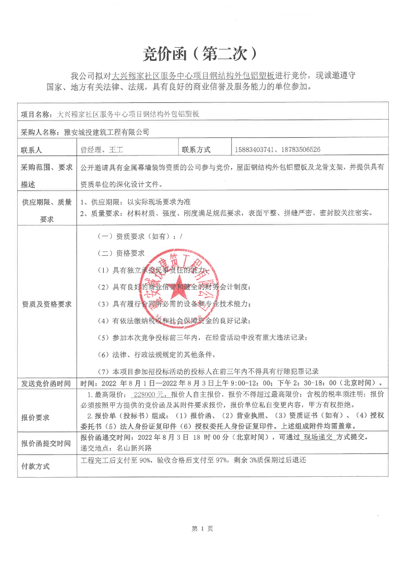 大興穆家社區(qū)服務(wù)中心項(xiàng)目鋼結(jié)構(gòu)外包鋁塑板競價公告(第二次)