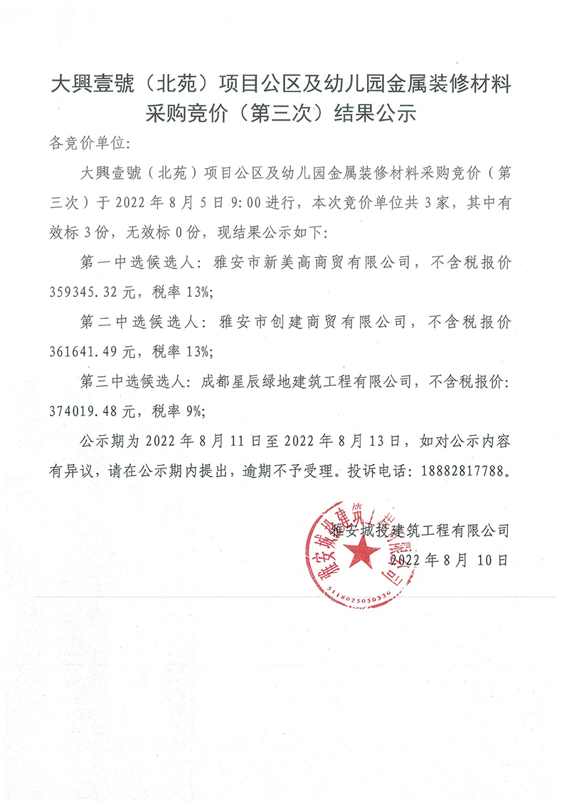 大興壹號(hào)(北苑)項(xiàng)目公區(qū)及幼兒園金屬裝修材料競(jìng)價(jià)(第三次)結(jié)果公示