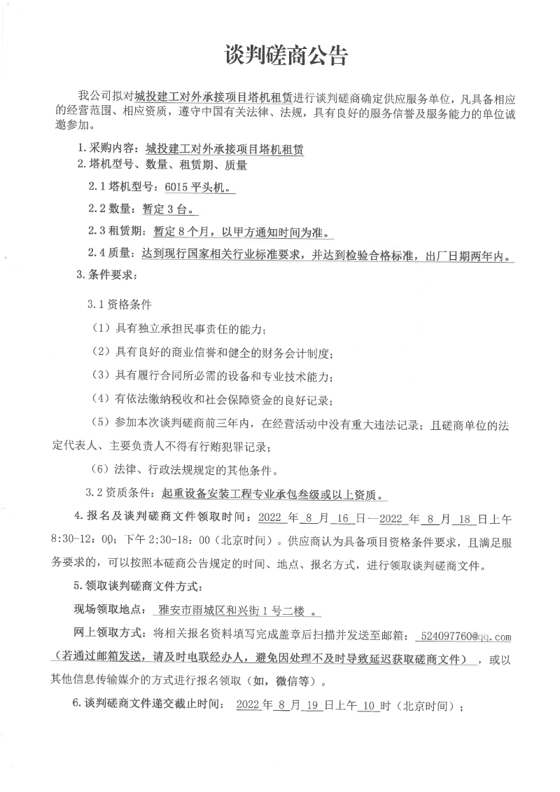 城投建工對外承接項目塔機租賃談判磋商公告