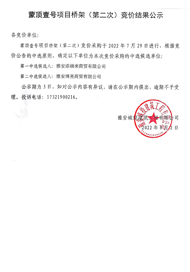 蒙頂壹號項(xiàng)目橋架(第二次)競價(jià)結(jié)果公示