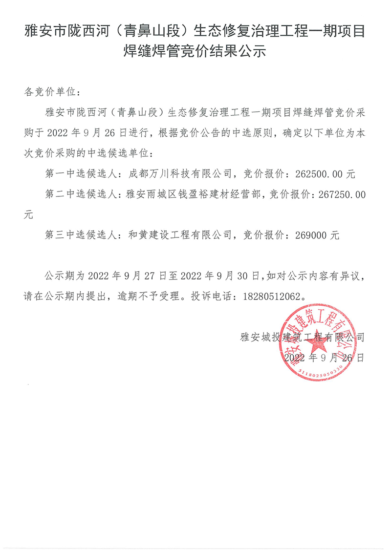 雅安市隴西河(青鼻山段)生態(tài)修復(fù)治理工程一期項(xiàng)目焊縫焊管采購競價結(jié)果公示
