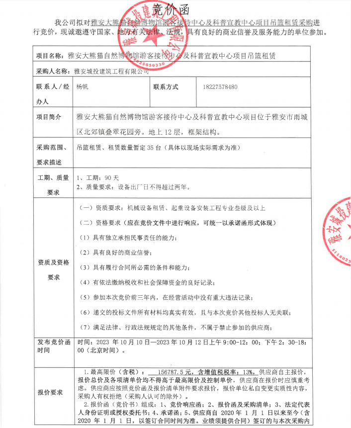 雅安大熊貓自然博物館游客接待中心及科普宣教中心項目吊籃租賃采購競價公告