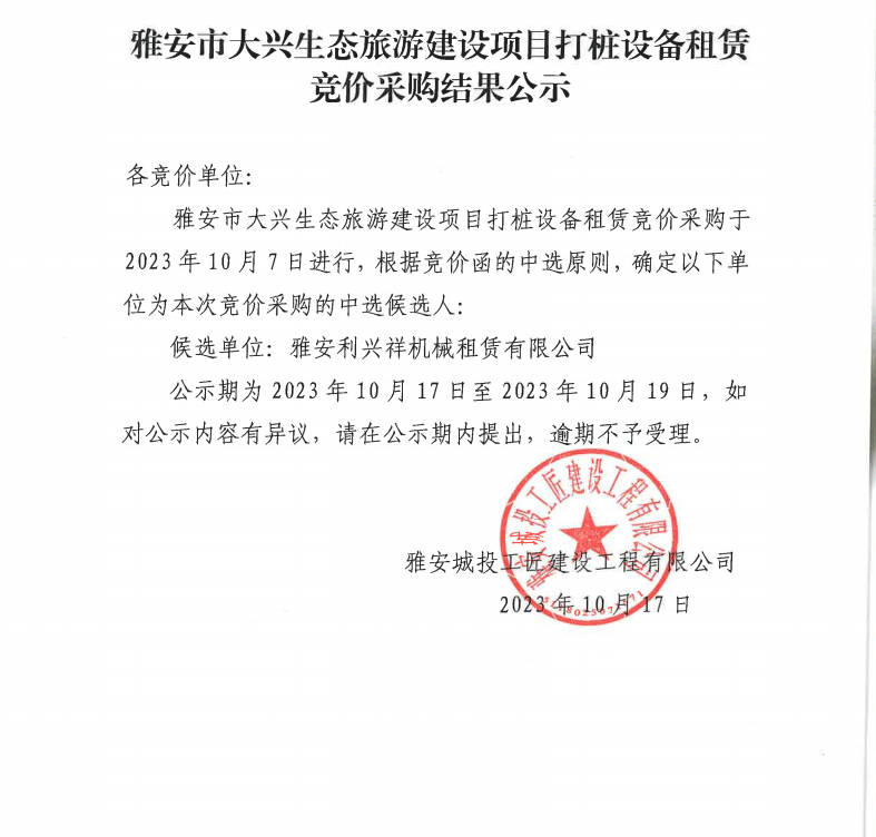 雅安市大興生態(tài)旅游建設項目打樁設備租賃競價采購結果公示