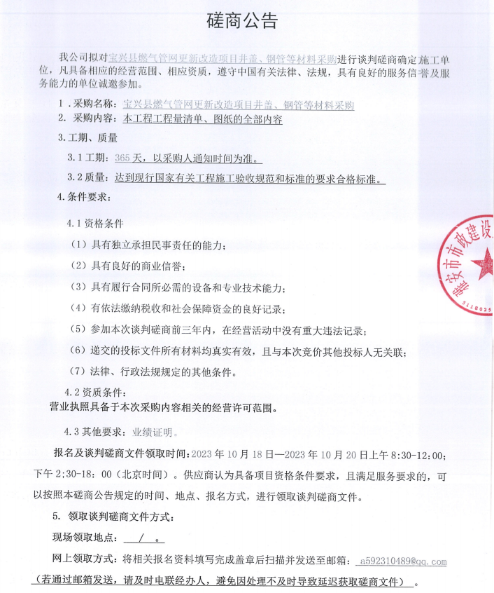 寶興縣燃氣管網(wǎng)更新改造項目井蓋、鋼管等材料采購談判磋商公告