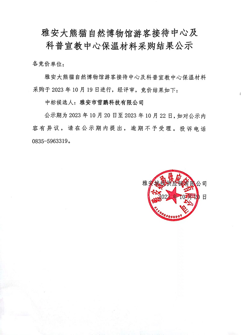 雅安大熊貓自然博物館游客接待中心及科普宣教中心保溫材料采購結果公示