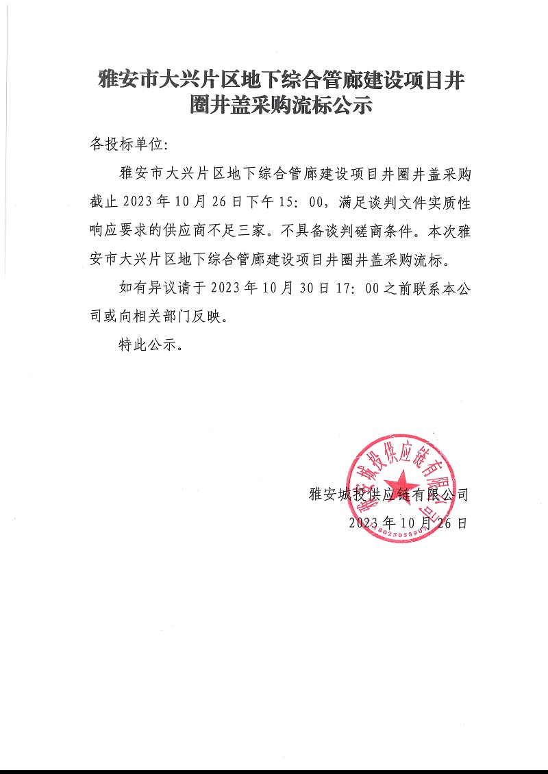 雅安市大興片區(qū)地下綜合管廊建設項目井圈井蓋采購流標公示