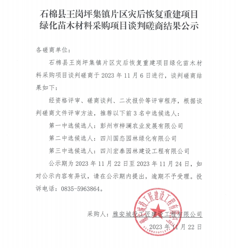 石棉縣王崗坪集鎮(zhèn)片區(qū)災(zāi)后恢復(fù)重建項(xiàng)目綠化苗木材料采購項(xiàng)目談判磋商結(jié)果公示