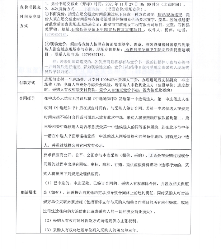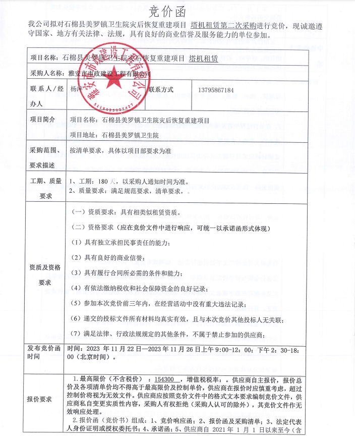 石棉縣美羅鎮(zhèn)衛(wèi)生院災(zāi)后恢復(fù)重建項(xiàng)目塔機(jī)租賃(第二次)采購競價公告