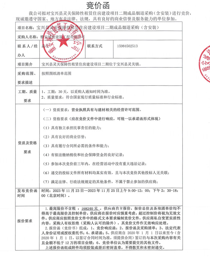 寶興縣靈關保障性租賃住房建設項目二期成品煙道采購(含安裝)競價公告