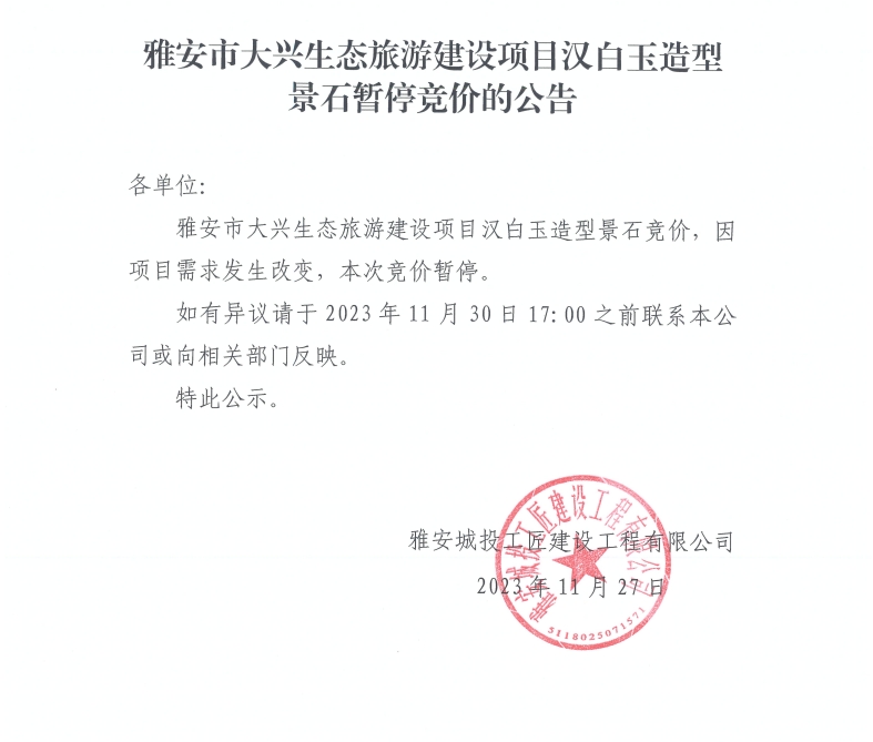 雅安市大興生態(tài)旅游建設(shè)項(xiàng)目漢白玉造型景石暫停競(jìng)價(jià)的公告