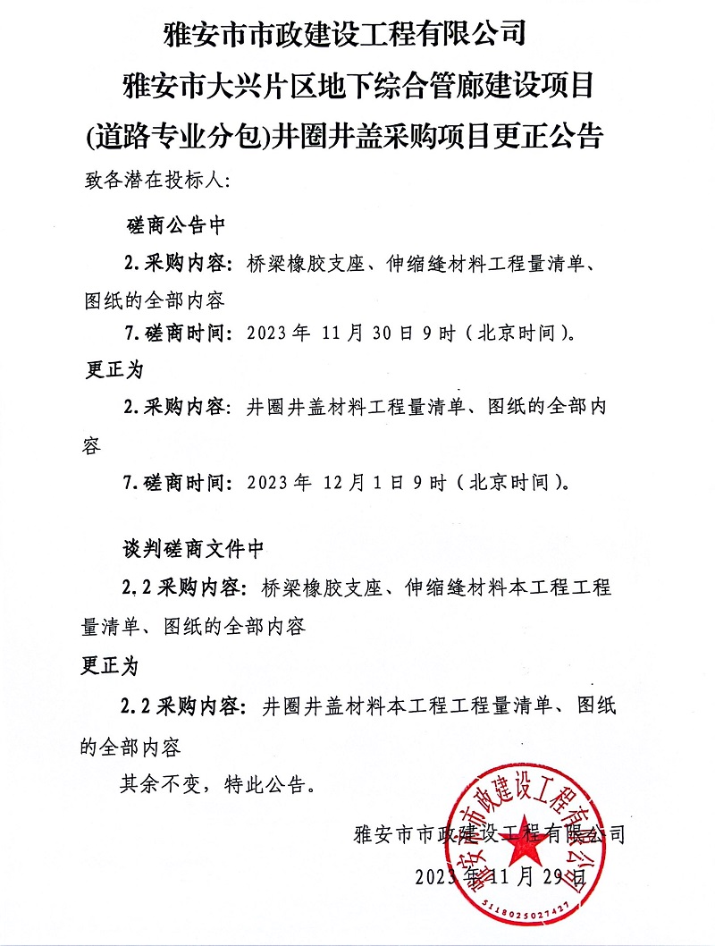 雅安市市政建設(shè)工程有限公司雅安市大興片區(qū)地下綜合管廊建設(shè)項(xiàng)目(道路專業(yè)分包)井圈井蓋采購項(xiàng)目更正公告