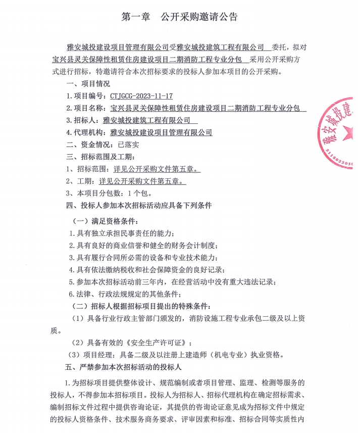 寶興縣靈關保障性租賃住房建設項目二期消防工程專業(yè)分包公開采購邀請公告