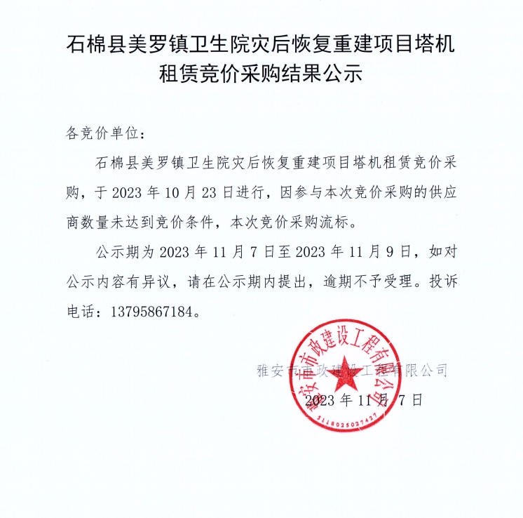 石棉縣美羅鎮(zhèn)衛(wèi)生院災后恢復重建項目塔機租賃競價采購結果公示