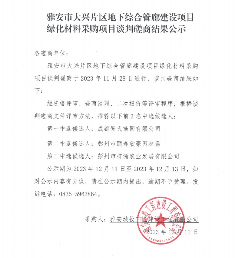 雅安市大興片區(qū)地下綜合管廊建設(shè)項(xiàng)目綠化材料采購項(xiàng)目談判磋商結(jié)果公示