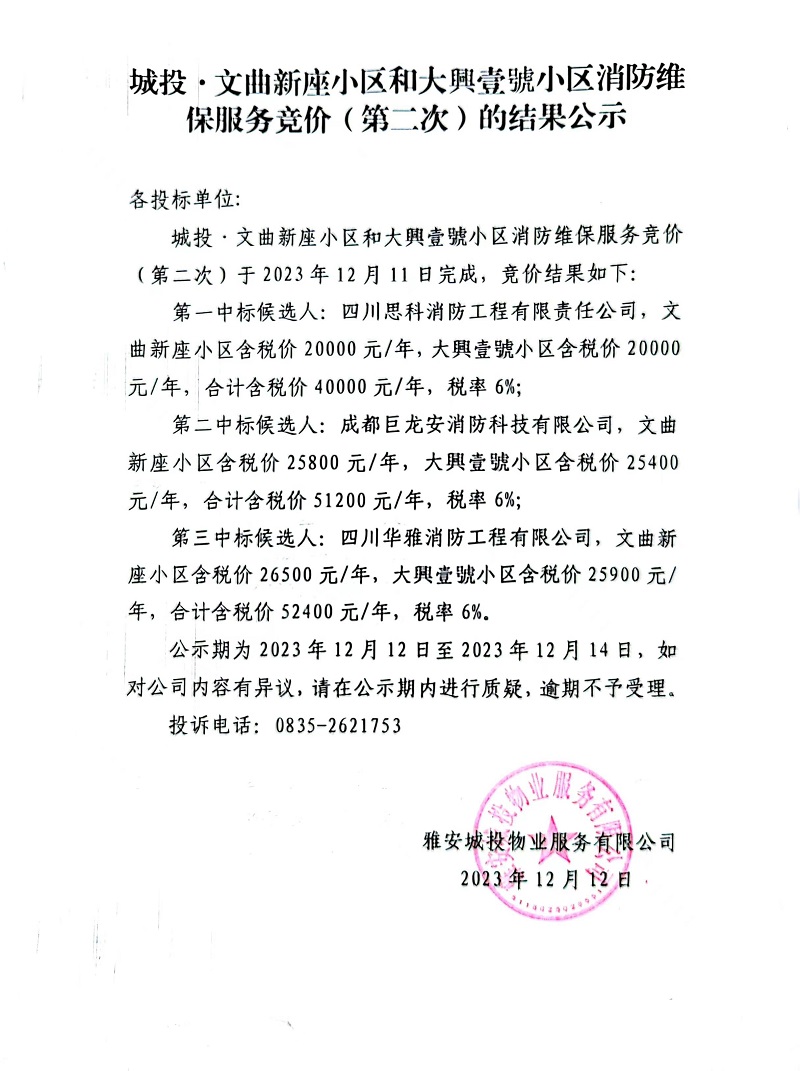 城投·文曲新座小區(qū)和大興壹號(hào)小區(qū)消防維保服務(wù)競價(jià)(第二次)的結(jié)果公示