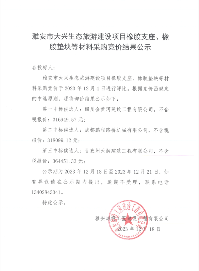 雅安市大興生態(tài)旅游建設(shè)項(xiàng)目橡膠支座、橡膠墊塊等材料采購(gòu)競(jìng)價(jià)結(jié)果公示
