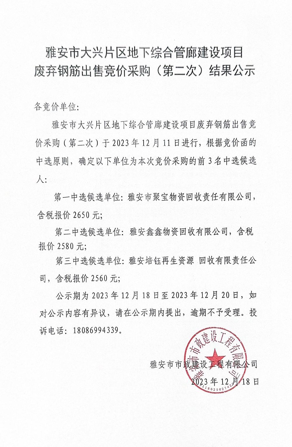 雅安市大興片區(qū)地下綜合管廊建設(shè)項(xiàng)目廢棄鋼筋出售競價(jià)采購(第二次)結(jié)果公示
