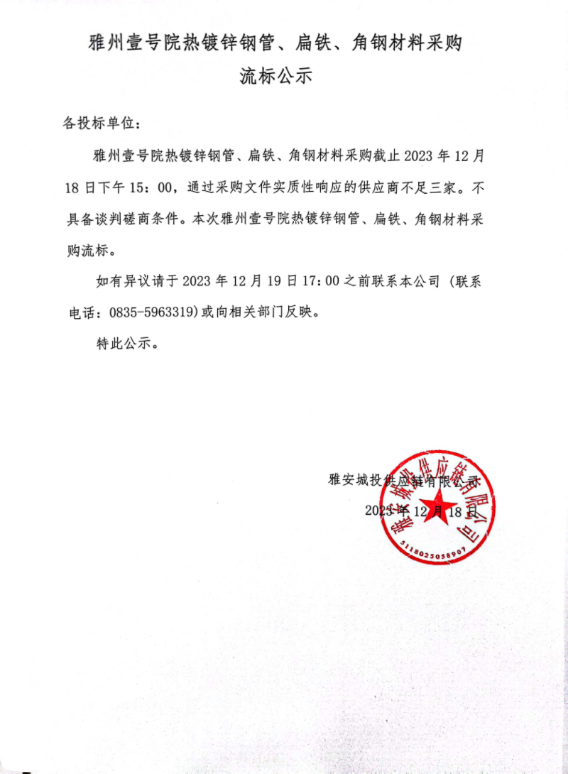 雅州壹號院熱鍍鋅鋼管、扁鐵、角鋼材料采購流標公示