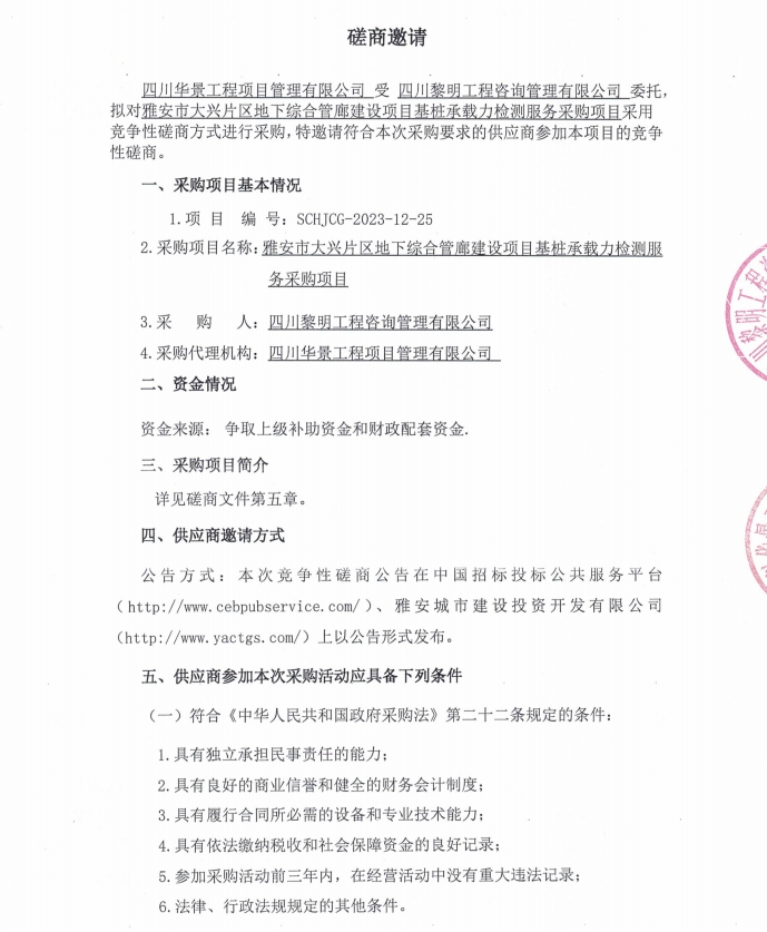 雅安市大興片區(qū)地下綜合管廊建設(shè)項(xiàng)目基樁承載力檢測(cè)服務(wù)采購(gòu)項(xiàng)目磋商邀請(qǐng)公告
