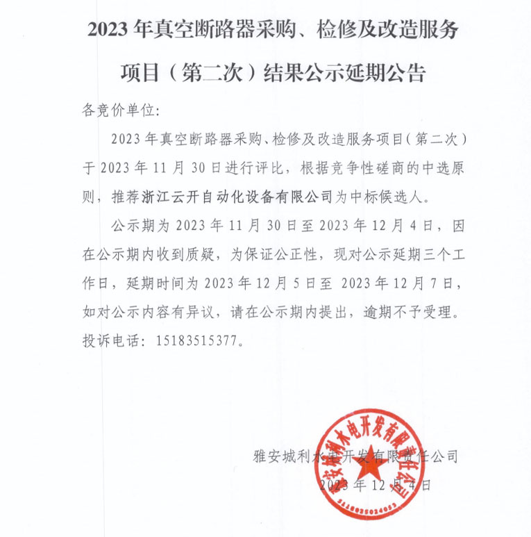2023年真空斷路器采購(gòu)、檢修及改造服務(wù)項(xiàng)目(第二次)結(jié)果公示延期公告