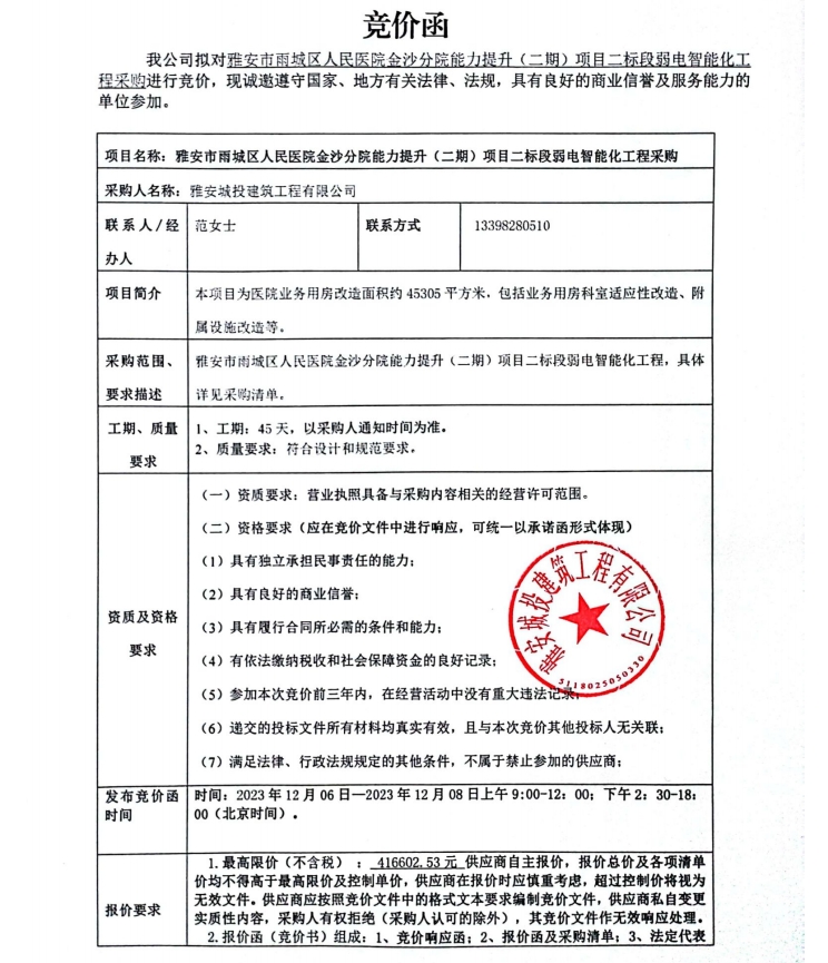 雅安市雨城區(qū)人民醫(yī)院金沙分院能力提升(二期)項(xiàng)目二標(biāo)段弱電智能化工程采購競價公告