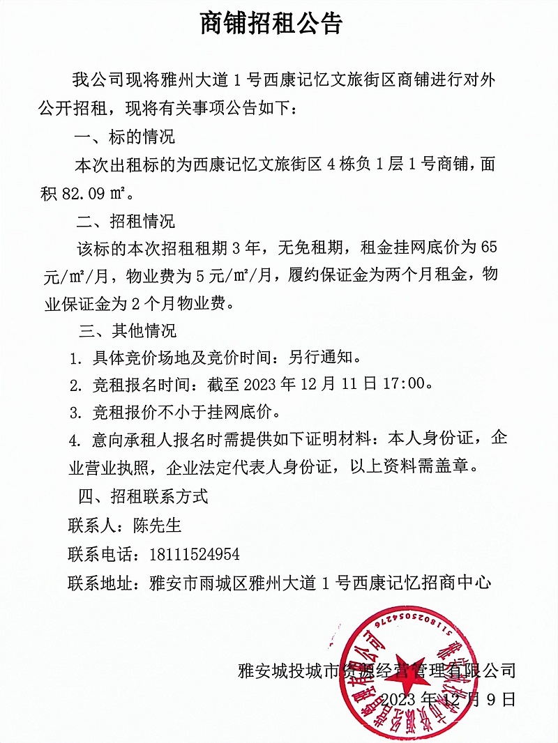 雅州大道1號(hào)西康記憶文旅街區(qū)4棟負(fù)1層1號(hào)商鋪招租公告