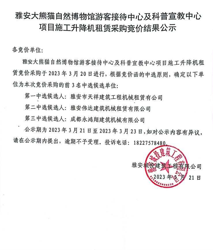 雅安大熊貓自然博物館游客接待中心及科普宣教中心項目施工升降機租賃采購競價結果公示