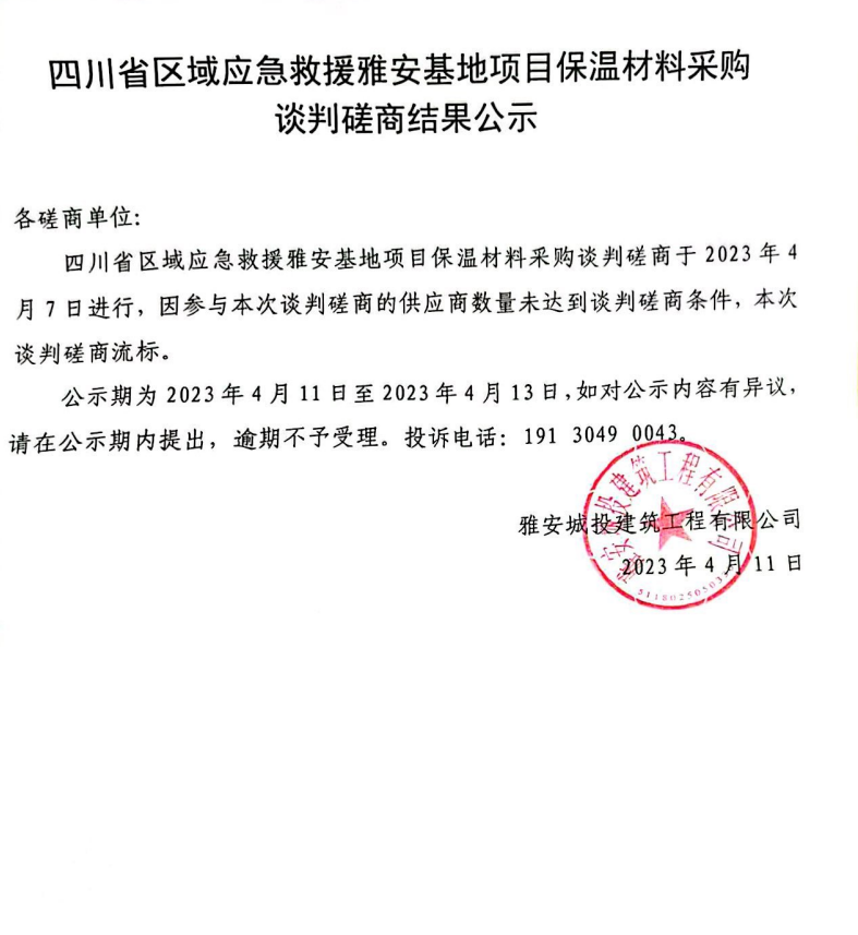四川省區(qū)域應(yīng)急救援雅安基地項(xiàng)目保溫材料采購談判磋商結(jié)果公示
