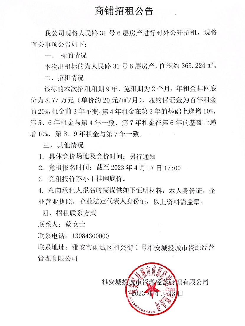 人民路31號6層房產(chǎn)商鋪招租公告