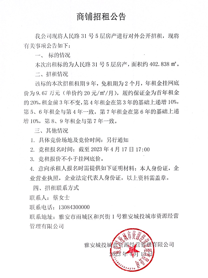 人民路31號5層房產(chǎn)商鋪招租公告