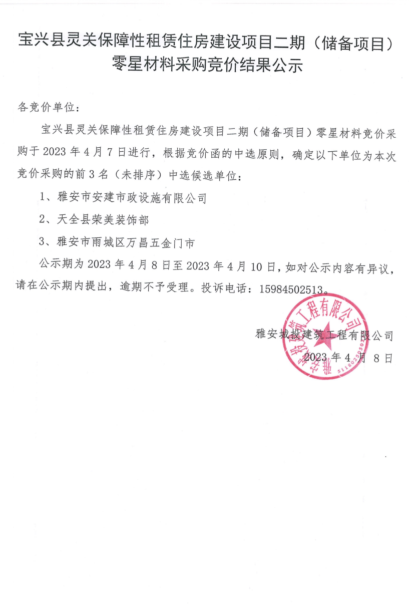 寶興縣靈關(guān)保障性租賃住房建設(shè)項(xiàng)目二期(儲(chǔ)備項(xiàng)目)零星材料采購競(jìng)價(jià)結(jié)果公示
