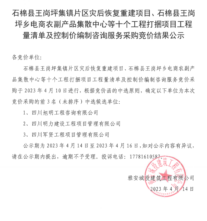 石棉縣王崗坪集鎮(zhèn)片區(qū)災(zāi)后恢復(fù)重建項(xiàng)目、石棉縣王崗坪鄉(xiāng)電商農(nóng)副產(chǎn)品集散中心等十個工程打捆項(xiàng)目工程量清單及控制價(jià)編制咨詢服務(wù)采購競價(jià)結(jié)果公示