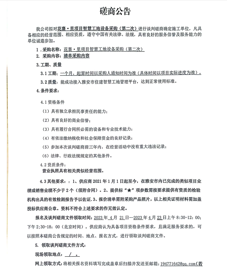 花襄·里項目智慧工地設備采購(第二次)談判磋商公告
