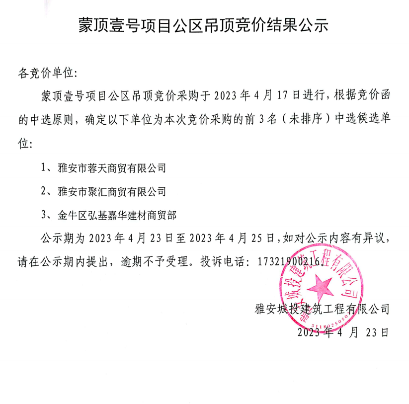 蒙頂壹號項(xiàng)目公區(qū)吊頂競價結(jié)果公示