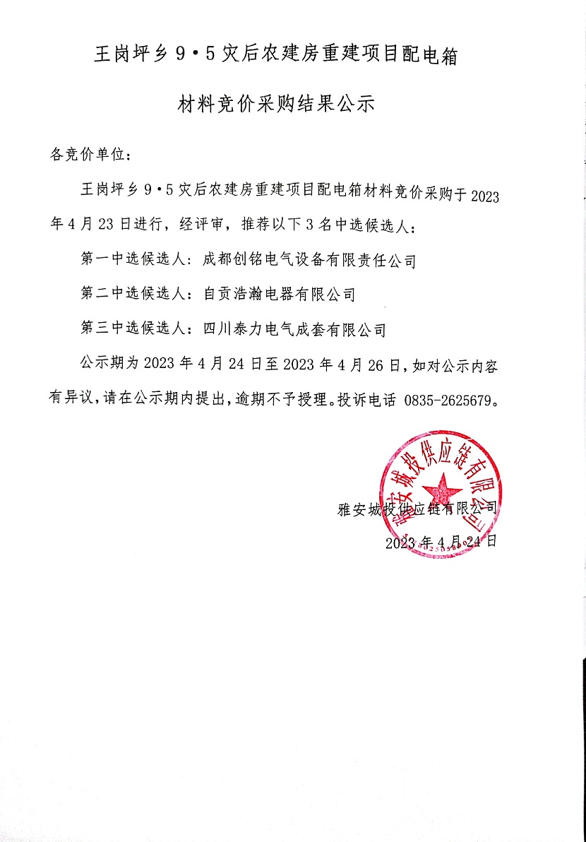 王崗坪鄉(xiāng)9·5災(zāi)后農(nóng)建房重建項目配電箱材料競價采購結(jié)果公示