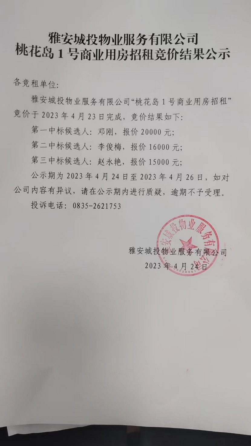 雅安城投物業(yè)服務有限公司桃花島1號商業(yè)用房招租競價結果公示