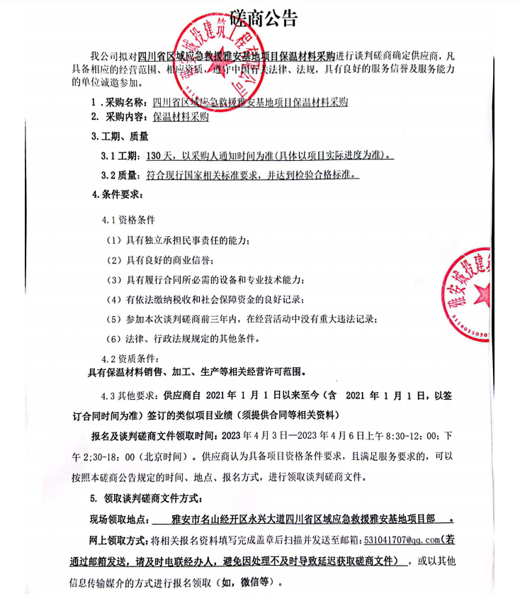 四川省區(qū)域應(yīng)急救援雅安基地項目保溫材料采購談判磋商公告