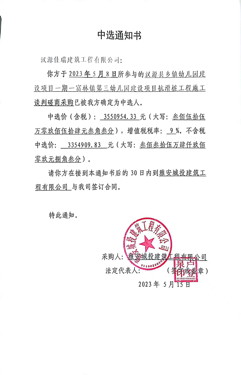 漢源縣鄉(xiāng)鎮(zhèn)幼兒園建設項目一期一富林鎮(zhèn)第三幼兒園建設項目抗滑樁工程施工談判磋商采購中選通知書