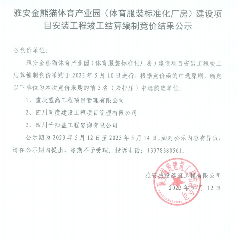 雅安金熊貓體育產(chǎn)業(yè)園(體育服裝標(biāo)準(zhǔn)化廠房)建設(shè)項目安裝工程結(jié)算編制競價結(jié)果公示
