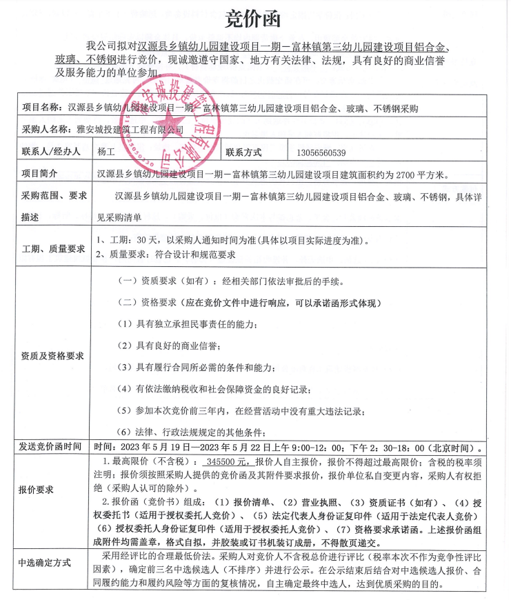漢源縣鄉(xiāng)鎮(zhèn)幼兒園建設項目一期一富林鎮(zhèn)第三幼兒園建設項目鋁合金、玻璃、不銹鋼采購競價公告