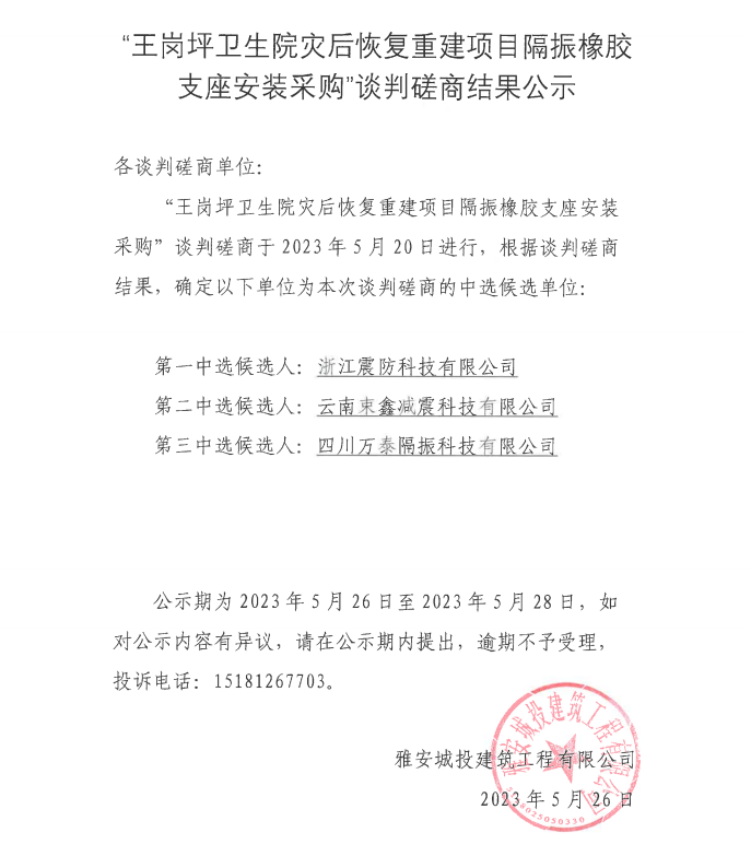 “王崗坪衛(wèi)生院災(zāi)后恢復(fù)重建項(xiàng)目隔振橡膠支座安裝采購”談判磋商結(jié)果公示