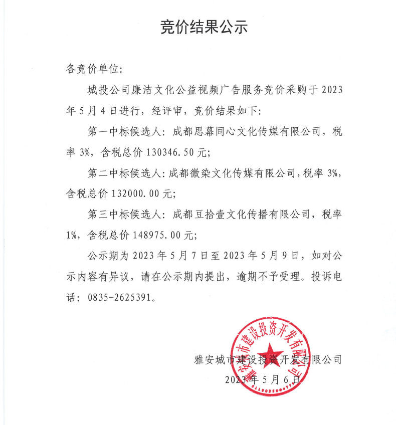 城投公司廉潔文化公益視頻廣告服務(wù)競價結(jié)果公示