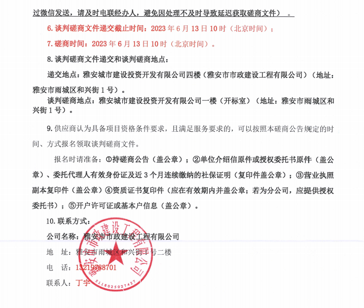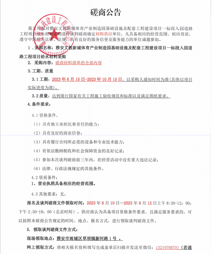 雅安文教新城體育產(chǎn)業(yè)制造園基礎(chǔ)設(shè)施及配套工程建設(shè)項(xiàng)目一標(biāo)段入園道路工程項(xiàng)目給水材料采購談判磋商公告