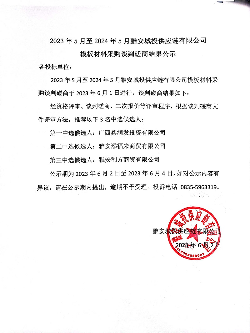 2203年5月至2024年5月雅安城投供應(yīng)鏈有限公司模板材料采購談判磋商結(jié)果公示
