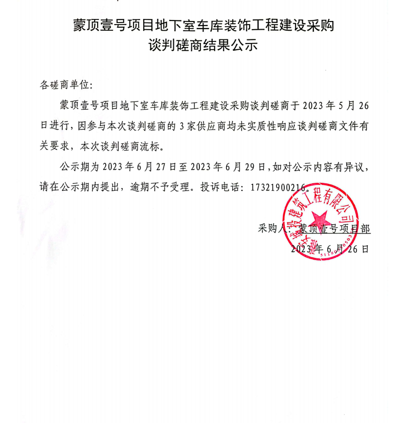 蒙頂壹號(hào)項(xiàng)目地下室車庫(kù)裝飾工程建設(shè)采購(gòu)談判磋商結(jié)果公示