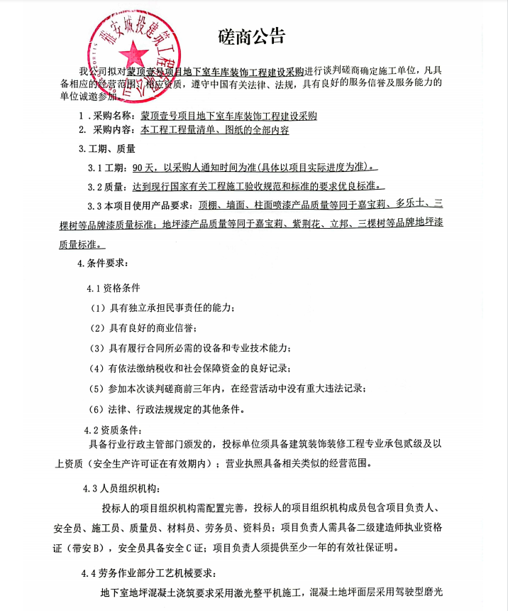 蒙頂壹號(hào)項(xiàng)目地下室車庫(kù)裝飾工程建設(shè)采購(gòu)談判磋商公告