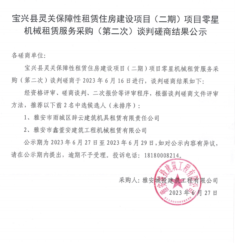 寶興縣靈關(guān)保障性租賃住房建設(shè)項(xiàng)目(二期)項(xiàng)目零星機(jī)械租賃服務(wù)采購(二次)談判磋商結(jié)果公示