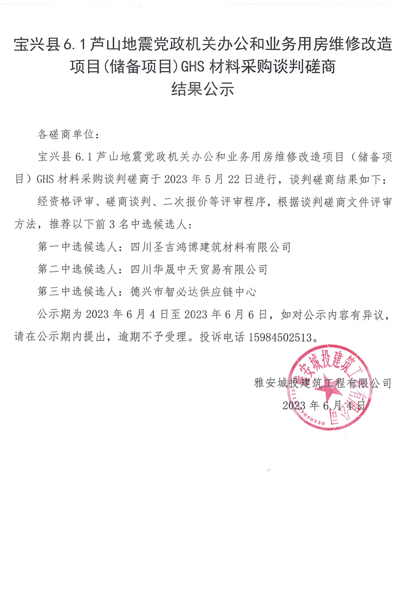 寶興縣6.1蘆山地震黨政機(jī)關(guān)辦公和業(yè)務(wù)用房維修改造項(xiàng)目(儲(chǔ)備項(xiàng)目)GHS材料采購(gòu)談判磋商結(jié)果公示