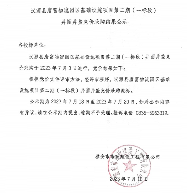 漢源縣唐富物流園區(qū)基礎(chǔ)設(shè)施項目第二期(一標段)井圈井蓋競價采購結(jié)果公示