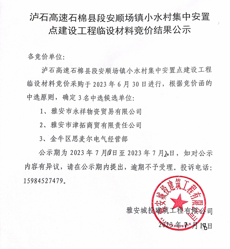瀘石高速石棉縣段安順場(chǎng)鎮(zhèn)小水村集中安置點(diǎn)建設(shè)工程臨設(shè)材料競(jìng)價(jià)結(jié)果公示